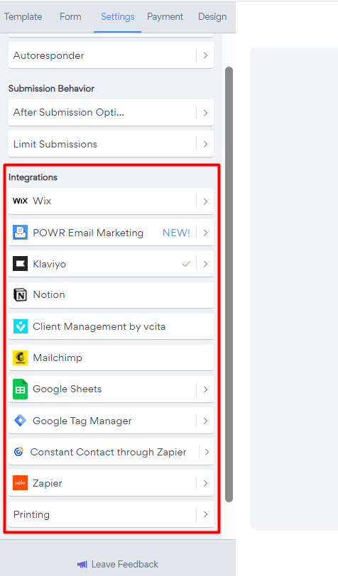 Still under the Settings, we offer a list of integration options such as Google Sheets, Klaviyo, Mailchimp, Zapier, Shopify Customers or Wix.